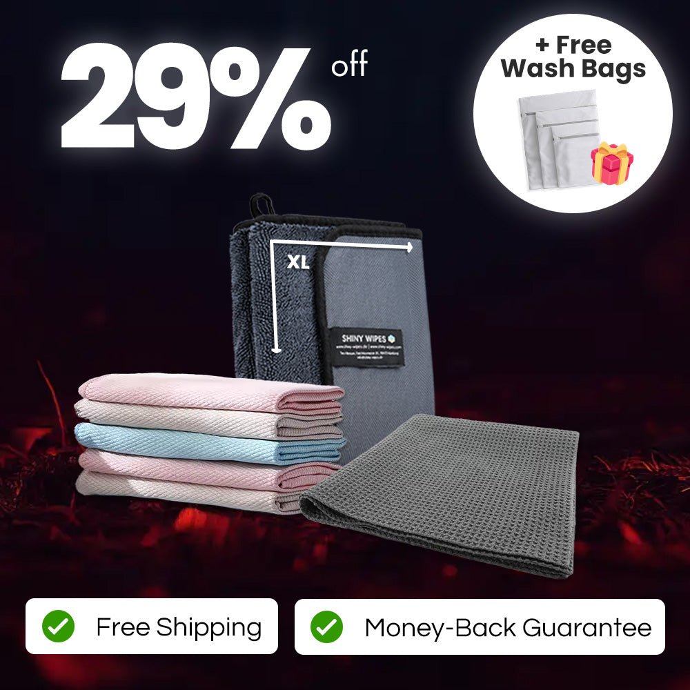 Everything you need for a spotless, streak-free shower without the hassle! The Spotless Shower Bundle includes our bestselling Shiny Bath™ XL Drying Towel, a set of 5 Shiny Wipes™ All-Purpose Cloths, and the XL Window Cloth for crystal-clear glass. Get 29% off compared to buying individually, plus enjoy free shipping, a 30-day money-back guarantee, and a free set of washing bags to keep your cloths in top shape.